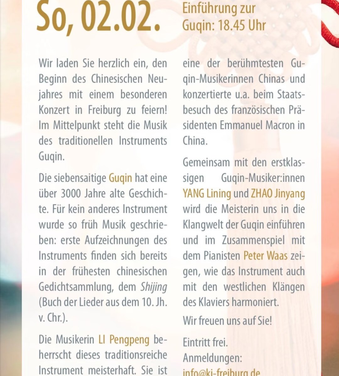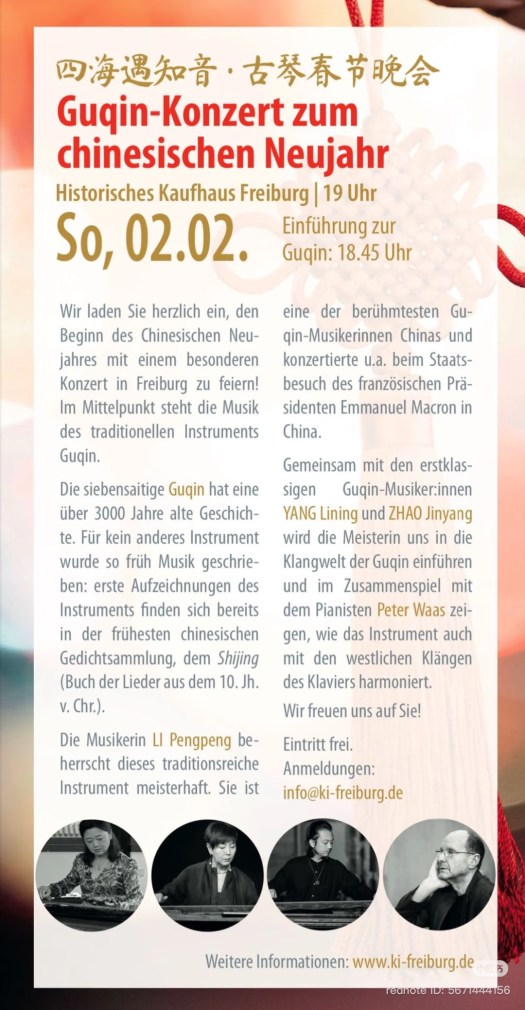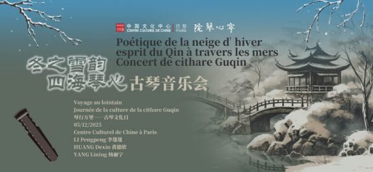 Le concert « Poétique de la neige d’hiver, esprit du Qin à travers les mers » réunit trois interprètes de Guqin de styles distincts et de contextes culturels variés – Li Pengpeng, Huang Dexin et Yang Lining. Associant pièces célèbres traditionnelles à adaptations contemporaines, ceux-ci révéleront la richesse du Guqin, des partitions anciennes et classiques traditionnels aux créations transdisciplinaires. Le programme du concert inclut les œuvres classiques ou créations novatrices telles que Versets de la cloche frappée, Reflet de la lune à la 2e Source, Pensée d’automne au reflet de parure, Eau coulante, Introduction à Nuit profonde, Chant nocturne d’ivresse de pêcheur. L’année 2025 marque le 600e anniversaire de la compilation du recueil de musique chinoise Shenqi Mipu (« Partition secrète et merveilleuse ») et le 130e anniversaire de la naissance du célèbre musicien moderne, Zha Fuxi ; le présent concert thématique « Esprit du Qin à travers les mers » fera résonner en l’hiver l’élégance structurée et intemporelle de la cithare Guqin, permettant au public de découvrir au sein des sonorités du Qin la profondeur et la vitalité contemporaine de la musique chinoise.